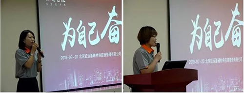 员工代表郝小红女士、耿俊芳女士相继讲话,,,,,,,,她们体现,,,,,,,,愿充分验展主人翁意识,,,,,,,,从我做起、忘我拼搏,,,,,,,,不扬弃、不放弃,,,,,,,,坚定不移与虹运配合生长。。。。。。。。