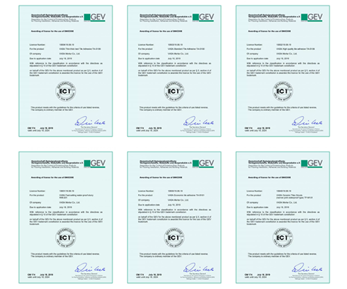 此次获得认证的六大产品包括通用强效型瓷砖胶TA-S100、经济型瓷砖胶TA-S101、重砖型瓷砖TA-S106、随意贴瓷砖胶TA-S109、瓷砖填缝剂(窄缝防水型)TF-M101、快硬防水浆料WM-201并所有取得EC1plus品级。。。。。