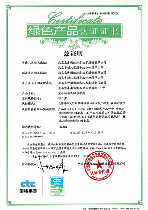 日前,,,,,,,腾博888诚信为本官方网站磨练认证集团(以下简称:国检集团)向东方腾博888诚信为本官方网站揭晓了首批绿色产品认证证书。。。。。。。。 依据GB/T 35609-2017《绿色产品评价 防水卷材与密封质料》的要求,,,,,,,国检集团对东方腾博888诚信为本官方网站工厂包管能力要求、产品一致性控制及绿色评价要求切合性等方面举行了严酷的现场检查与抽样磨练,,,,,,,东方腾博888诚信为本官方网站此次申报的“弹性体改性沥青防水卷材(非外露 PY Ⅱ型 )”和“聚合物水泥防水涂料(非外露)”两类产品获绿色产品认证证书。。。。。。。。