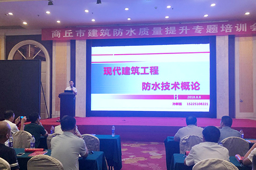 8月8日,,,,,,商丘市举行修建防水质量提升专题培训会。。。。。。商丘市工程质量监视站站长张彦峰、东方腾博888诚信为本官方网站工渠事业部大郑州手艺副总工程师孙新磊出席聚会。。。。。。来自商丘市各县区的质监站、建设、施工、监理、检测及有关单位认真人共300余人加入聚会。。。。。。
