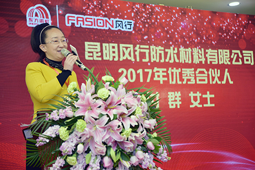 时代,,,,,公司还为2017年有突出孝顺的经销商揭晓了声誉奖,,,,,为合资人授予了“战略合资人”牌匾。。。。。。优异经销商、合资人代表付群女士致辞体现作为盛行防水的相助同伴,,,,,她将通过自身的起劲让更多的人感受到盛行的真诚与超值的服务,,,,,越发支持与信托盛行。。。。。。