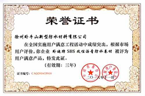 克日,,,,,,,,中国质量协会、天下用户委员会举行了2016年天下实验用户知足工程评选运动。。。。。。。依附高品质的产品、卓越的用户体验,,,,,,,,卧迪牌SBS改性沥青防水卷材在众多强劲敌手中脱颖而出,,,,,,,,摘得“天下实验用户知足工程先进单位用户知足产品”声誉称呼。。。。。。。