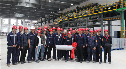 咸阳生产基地厂长刘晓俊和生产的第一卷卷材合影