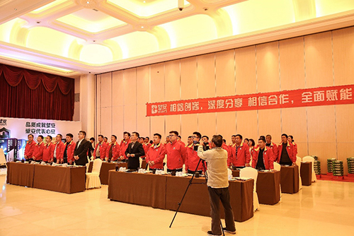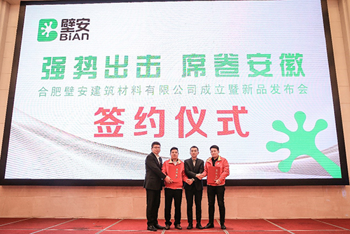 会上,,, ,,,,东方腾博888诚信为本官方网站民用建材有限责任公司市场营销总监汪忆首先致辞。。。。。。民建公司壁安粘合剂事业部总司理陈明做题为“选择壁安,,, ,,,,开启好人赚钱时代”的演讲,,, ,,,,剖析目今市场形势,,, ,,,,叙述壁安品牌的意义、愿景,,, ,,,,及壁安的生意模式和战略妄想,,, ,,,,并代表壁安品牌与合肥壁安修建质料有限公司董事长谢齐和现场签约。。。。。。