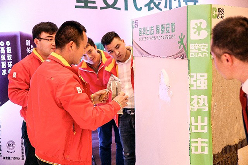民建公司高级产品司理潘佳对壁清静品类产品做详细先容。。。。。。大会共宣布壁顺产品21种,,, ,,,,涵盖瓷砖胶、腻子粉、界面剂、堵漏宝、填缝剂、防水等品类。。。。。。为更好地展示产品性能,,, ,,,,合肥外地着名瓦工杜师傅和意向客户现场对部分产品举行试刷,,, ,,,,并约请与会嘉宾上台感受产品的施工体验。。。。。。