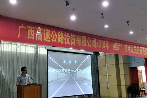 会上,,,,,, ,刘国庆先容了目今高速公路防水系统、高密度聚乙烯自粘胶膜预铺反粘防水系统及应用,,,,,, ,并分享了聚丙烯长丝土工布在高速公路护坡及路基路面的应用。。。。。。