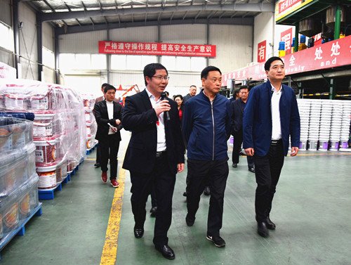 岳阳东方腾博888诚信为本官方网站厂长向锋向导考察组旅行了生产基地水性涂料车间和高分子卷材车间,,,,,,详细汇报了东方腾博888诚信为本官方网站及岳阳生产基地的总体谋划情形,,,,,,并解说了公司主要产品的生产工艺、产品优势及重大工程应用情形。。。。。