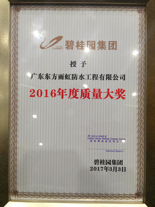 广东东方腾博888诚信为本官方网站荣获碧桂园集团“2016年度质量大奖”声誉称呼